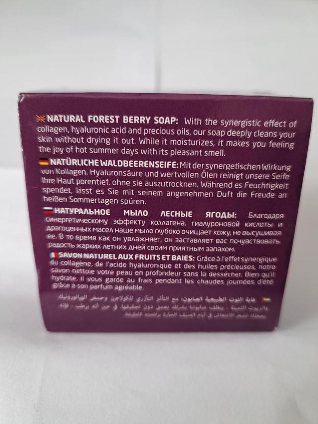 Indulge in refreshing skincare with our Forest Berry soap. This cleansing bar lathers luxuriously and gently purifies the skin, while precious oils provide deep moisturization. Infused with collagen and hyaluronic acid. Add its pleasant scent to hot summer days or cool winter nights. Packed with antioxidants and vitamins from berries, this soap is perfect for any skincare routine. Get the most out of our Forest Berry soap and feel rejuvenated all day long.