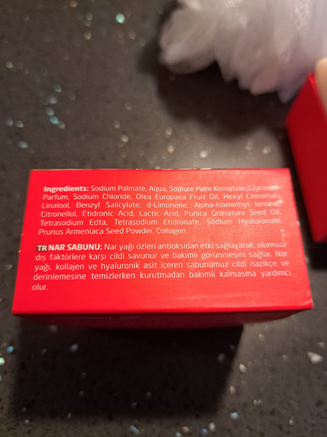 Sodium palmate, Aqua, Sodium palm kernelate, Glycerin, Parfum, Sodium chloride, Olea europaea fruit oil, Etidronic acid, Lactic acid, Punica granatum seed oil, Tetrasodium EDTA, Tetrasodium etidronate, Sodium hyaluronate, Prunus armeniaca seed powder & Collagen.