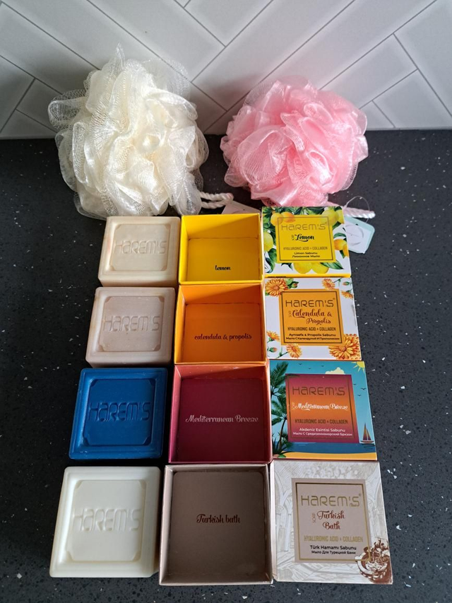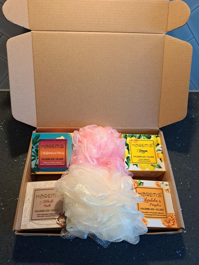 Four Soap Bars (4 X 120 grams = 480 grams) and 2 Scrunchs (Colour may vary).